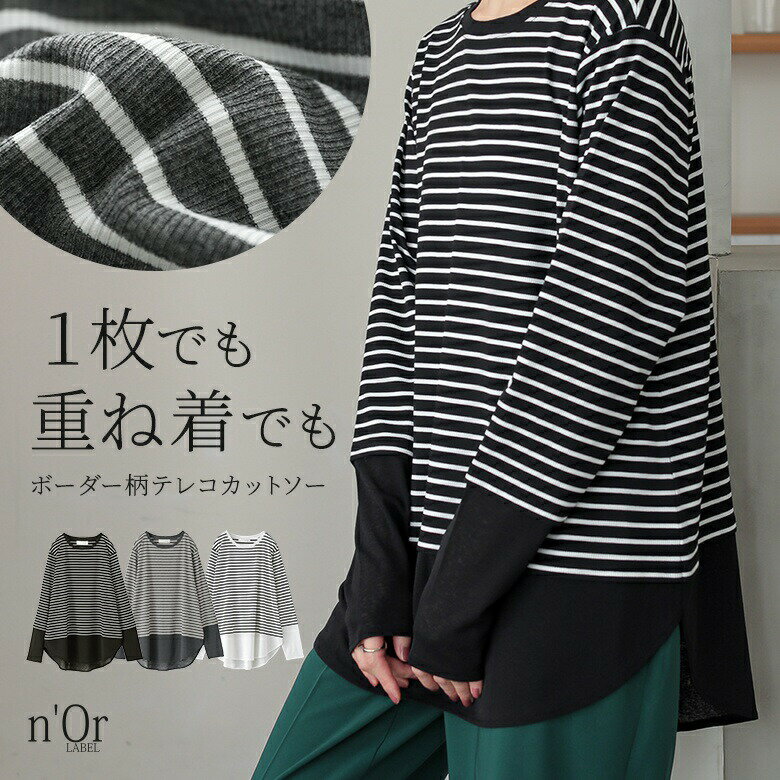 カットソー 長袖 レディース トップス インナー ボーダー柄 レイヤード シアー 透け感 異素材 配色 体型カバー Tシャツ ロンT プルオーバー クルーネック 無地 スラブ 異素材MIX 春 秋 冬 オシャレウォーカー※メール便可※【10】