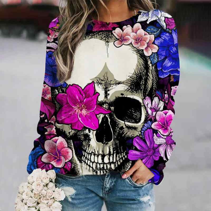 トレーナー レディース 秋 ハロウィン 3D デジタルプリント プルオーバー 丸首 長袖 スカル ドクロ ローズ バラ ゴシック ストリート カジュアル ポリエステル 中厚手 レギュラーフィット