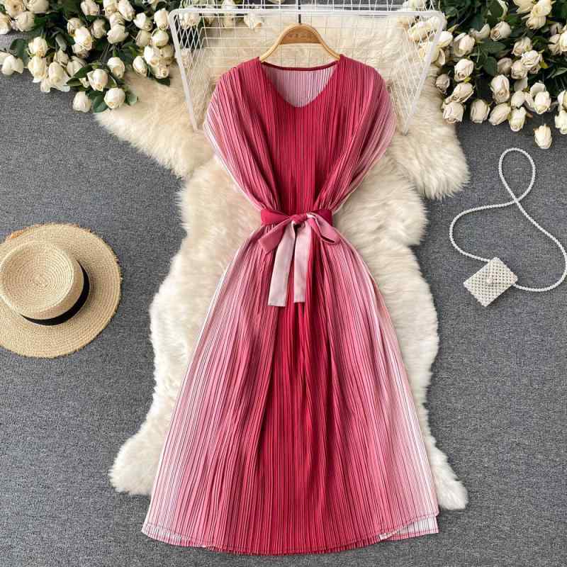 ワンピース レディース 上品 エレガント 大人可愛い 五分袖 ラウンドネック ウエストマーク ハイウエスト 体型カバー Aライン フレア グラデーションカラー プリント プリーツ ロング丈