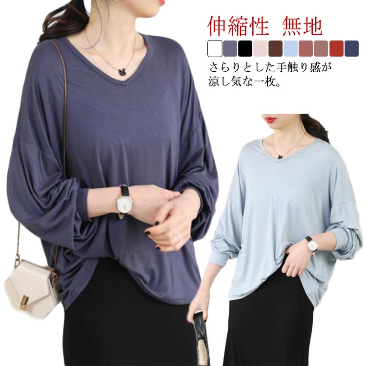 カットソー レディース 長袖 Tシャツ Vネック プルオーバー トップス 無地 シンプル 伸縮性 ストレッチ インナー ゆったり ゆるtシャツ 大きいサイズ 体型カバー きれいめ カジュアル オフィス 春 夏 秋 冬 オールシーズン 送料無料
