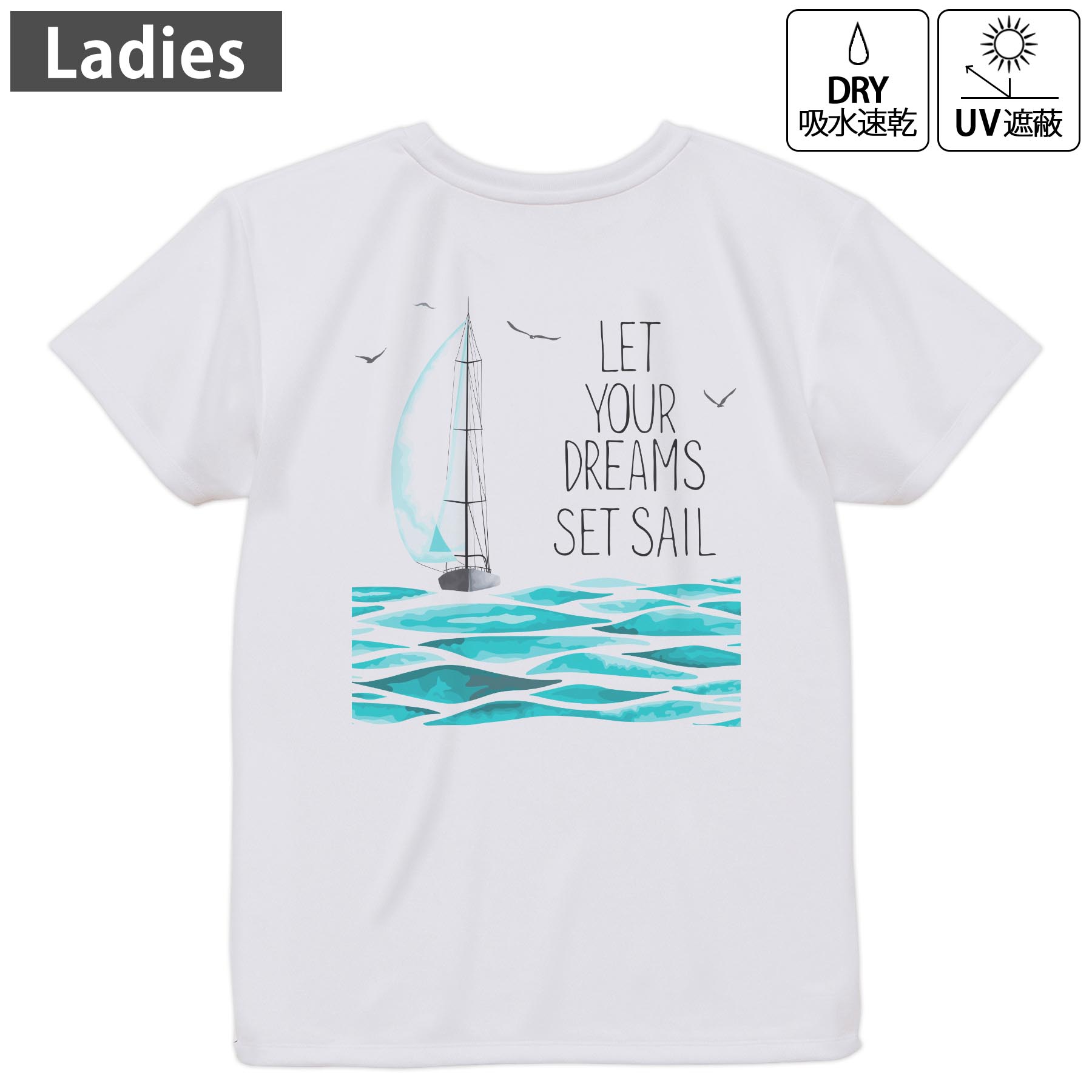 レディース ドライバックプリントTシャツ ホワイト 半袖 4.1オンス ジム トレーニング スポーツ 運動会 ドライアスレチック UVカット 紫外線遮蔽 吸水速乾 デザイン Tshirt M L 014200 海 船 英語