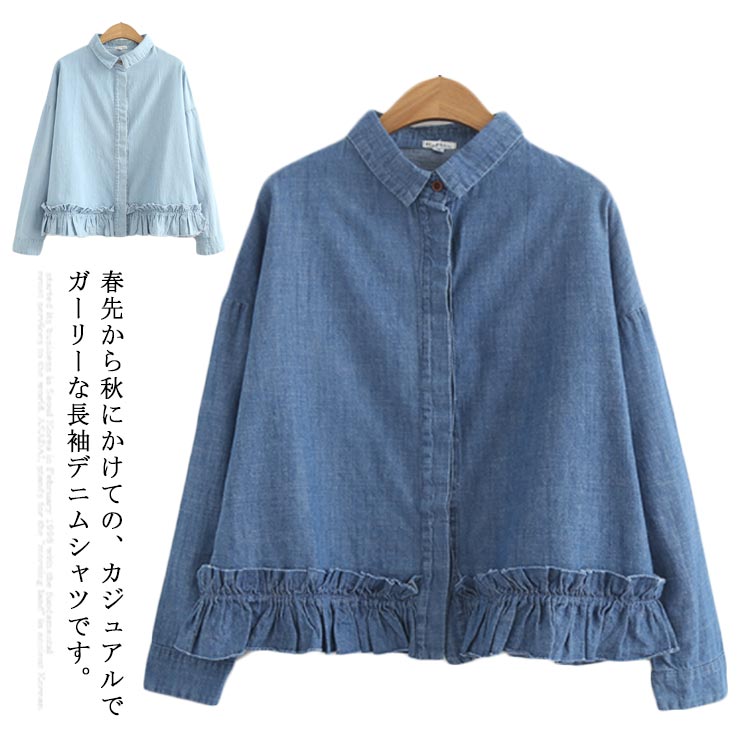 春先から秋にかけての、カジュアルでガーリーな長袖デニムシャツです。 薄すぎず厚すぎずちょうど良い生地感なのでオールシーズン重宝してくれます。 やわらかいコットン素材なので締め付け感なく動きやすく着心地も楽ちんデニムアウターです。 前を開けて羽織りとしてロングジャケットにもなり大人カジュアルな着こなしにも。 サイズ M L サイズについての説明 M:総丈54 肩幅58 バスト106 袖丈42L :総丈55 肩幅59 バスト110 袖丈43 素材 綿混 色 ライトブルー ダークブルー 備考 注意★洗濯時、色落ちがございます。他の物とのお洗濯もお控えくださいませ。 湿気を含んだ状態や水を含んだまま放置しないでください。 この製品は洗濯で若干縮むことがあります。洗濯機は使用できません。※ベージュ×モカのみ使用糸の関係上、風合いが少々異なります。 ●色合いはモニター環境により若干の誤差が出ます。 ●綿混合商品は洗濯時に多少縮む事がございます。 ●本製品は生産過程におきまして、生地を織る際の糸の継ぎ目や多少のほつれが生じることがありまが、品質上は問題ありません。また、生地の織りに他繊維が混紡している場合もございます。 ▼色落ちの恐れがございますので、他のものとは分けて洗濯してください。 ▼タンブラー乾燥はお避け下さい。 ▼洗濯の際は他の物と区別して、漂白剤を避け、手洗いを お勧めします。