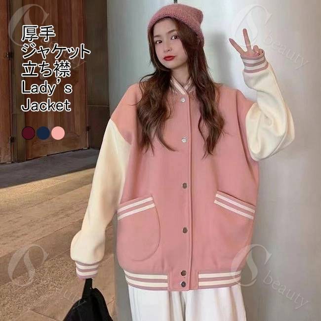 【送料無料】スタジアムジャンパー レディース アウター 立ち襟 長袖 前開き 厚手 リブ裾 トップス カジュアル ボタン付き ジップ付き ポケット付き 体型カバー ゆったり シンプル 出掛け 秋冬 普段着 通学 ストリート系 ジャンパー ジャケット