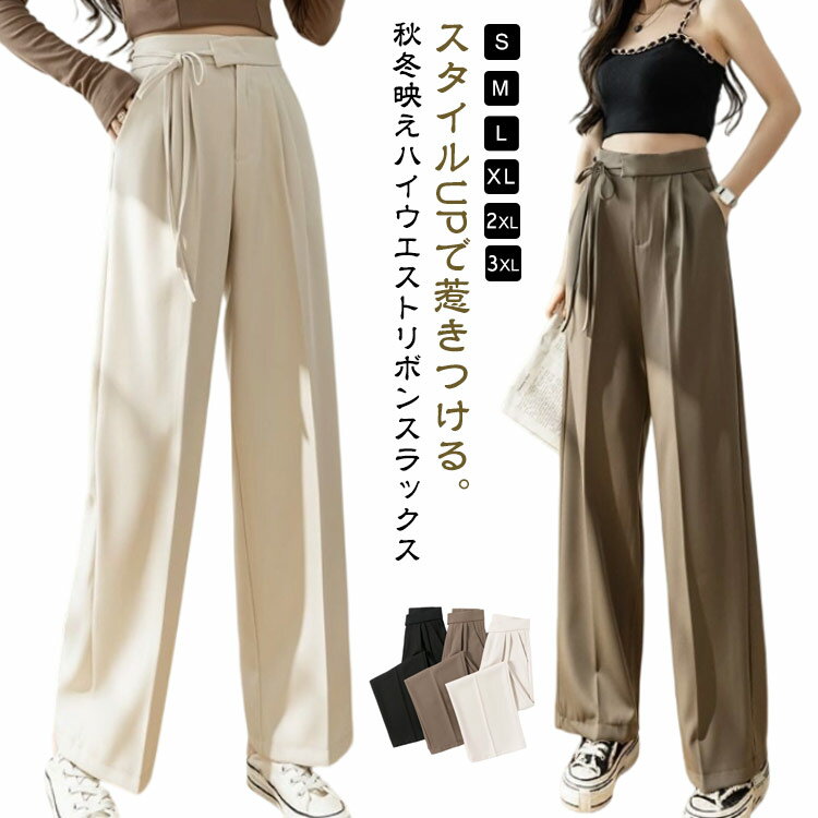 ダブルタック スラックス ウエストリボン きれいめ レディース ストレートパンツ ワイドパンツ ハイウエスト 美脚 脚長 女性 低身長 ボトムス 長ズボン ワイド ゆったり スッキリ 細見せ スリム 通勤 オフィス カジュアル 【送無】