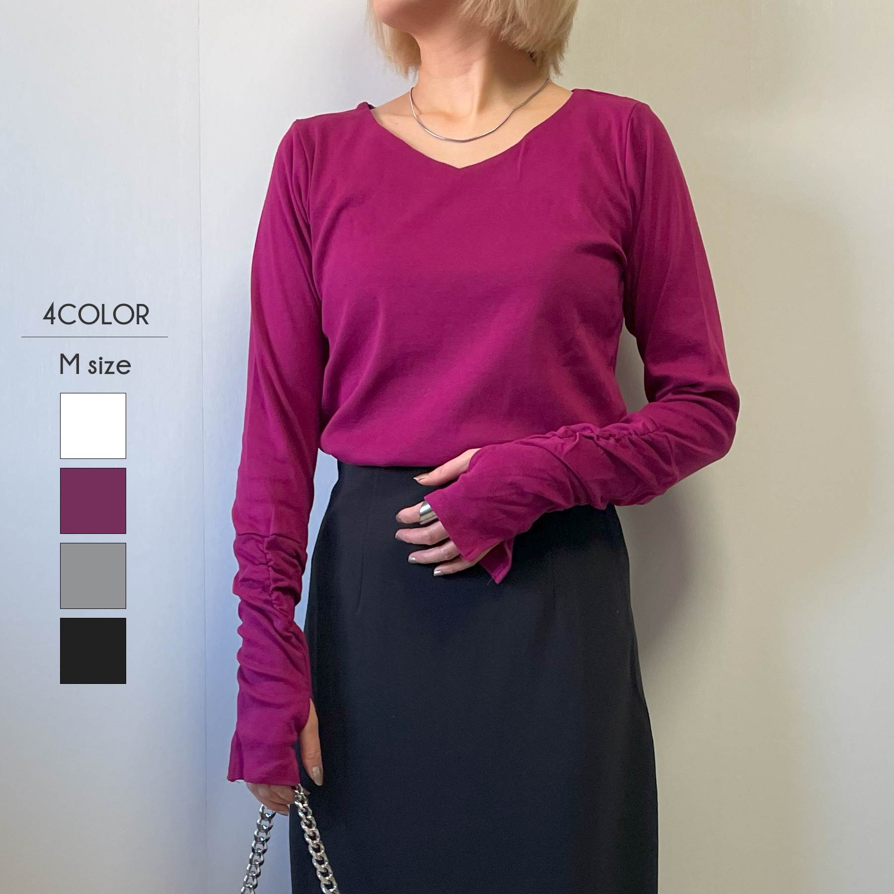 \スーパーSALE半額クーポン/Tシャツ レディース 春 夏 Vネック 長袖 くしゅくしゅ ロンT 指空き 指穴 ロングスリーブ コットン 20代 30代 40代 50代 韓国 ファッション