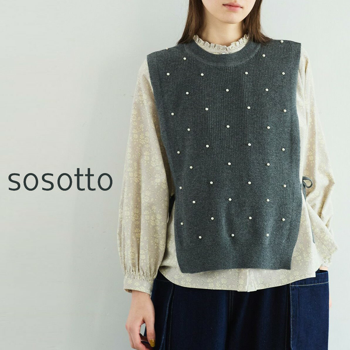 【16%オフ・クーポン対象】sosotto ソソット ベスト ニット クルーネック サイド リボン パール コットン 綿 100%