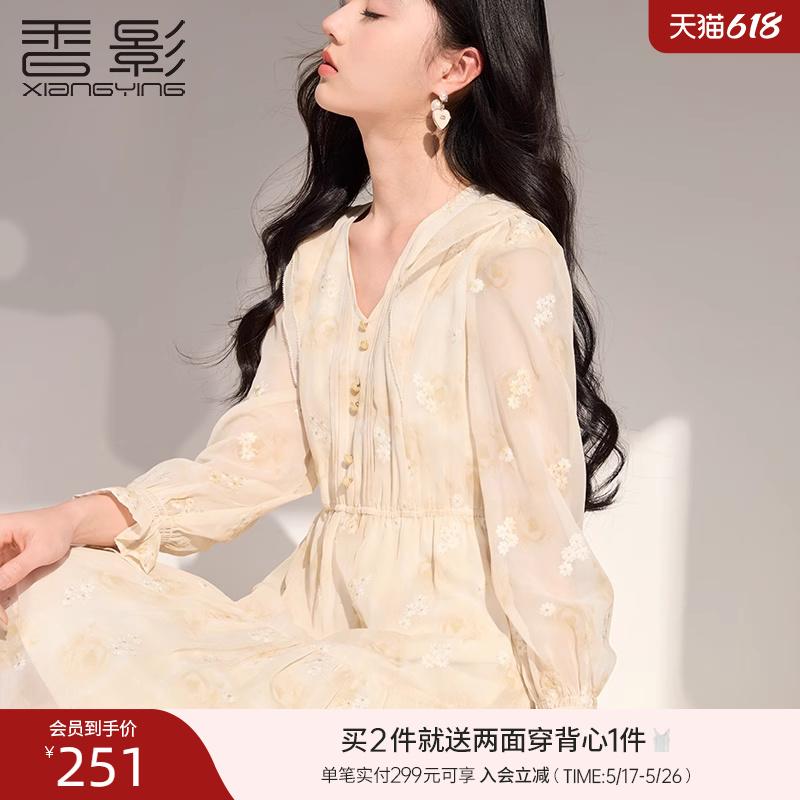 きれいめ 体型カバー 上品 かわいい シフォンドレス ワンピース レディース Xiangying シフォン ドレス レディース 2025 春 イエロー ハイウエスト ホリデー ビーチ プリント aライン スカート