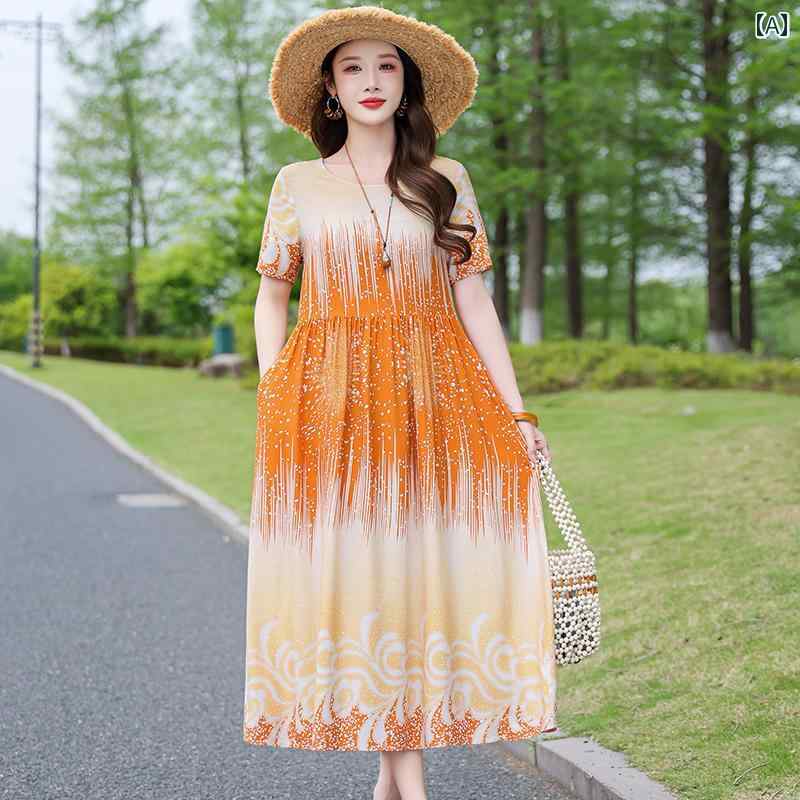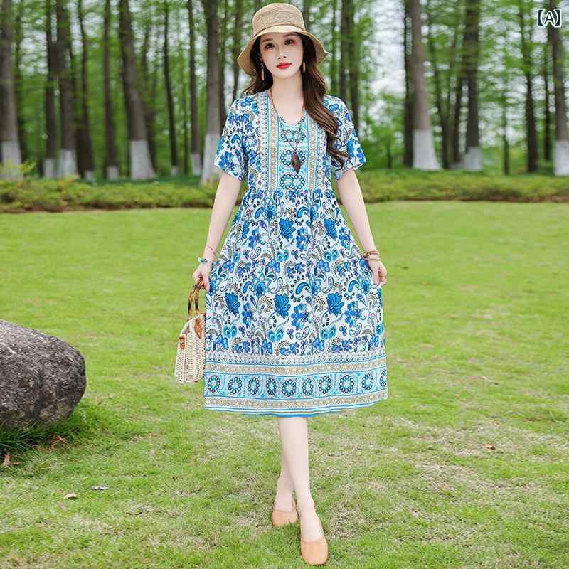 レディース ファッション おしゃれ 春夏 秋 冬 大人 上品 高級 マダム ミス ミセス プレゼント コットンワンピース レディース 夏 ハイエンド おしゃれ ママ ミドル スリーブ 花柄 ホリデー ビーチ ロング スカート