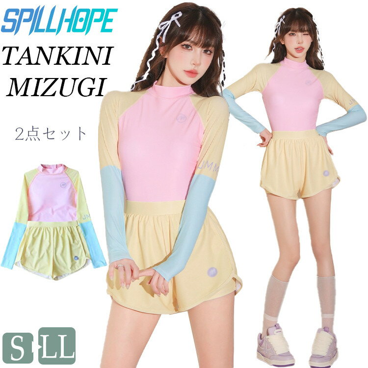 虹色 2点セット 水着 中学生 高校生 体型カバー ワンピース水着 オールインワン ショートパンツ パッド付き ビーチ水着 レディース水着 長袖 日焼け防止 お洒落 お腹 プール 旅行 スパ 温泉 修学旅行 UVカット おしゃれ スキニー スリム ホリデー ビーチバレー スポーティー