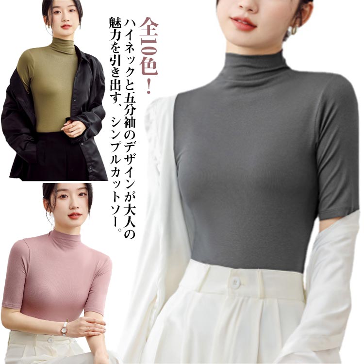 タイト ハイネック ハイネック 春夏 五分袖カットソー tシャツ インナー トップス ハイネックtシャツ 着痩せ シンプル 無地 おしゃれ カットソー 可愛い 肌着 ストレッチ 大人女性 シンプル 重ね着 かわいい 5分袖tシャツ 通勤