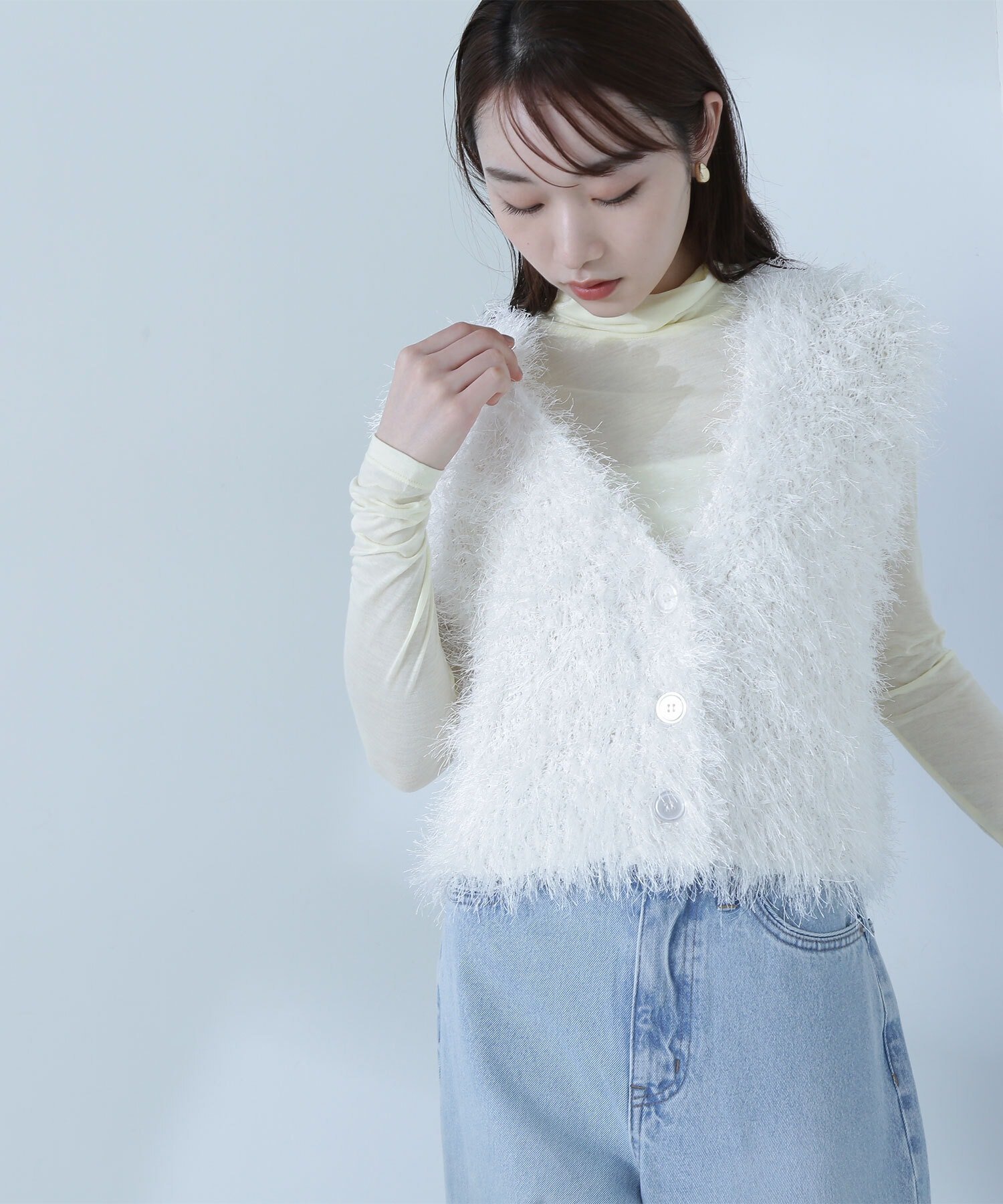 NATURAL BEAUTY BASIC(ナチュラルビューティベーシック)フリンジシャギーニットベストOggi掲載アイテム<お出かけ・デイリーにおすすめ>春夏注目トレンドのフリンジのような編地が特徴のニットベスト。ボリュームがありコーディネートに取り入れるだけで映えるデザインは、ドライタッチな糸を使用しているので夏まで着ていただけます。フロント釦を開けてジレのような着こなしや、シアーインナーを合わせたり、真夏はキャミソールの上に重ねて一枚着としてもおすすめ。肩先が落ちたリラクシーなボクシーサイズでこなれ感のあるスタイリングが叶います。<素材>ドライタッチで毛足のような糸をフリンジのような見え方にしています。つやっとした糸も混ざっていてカジュアルすぎない編地です。<詳細>仕様・前ボタン裏地・なし透け感・なし / 光沢・ややあり / 伸縮性・あり 生地の厚さ・普通※モデルの着用画像の場合、光の当たり具合により、実際の色味と異なって見えることがございます。色味は、商品単体の画像をご参照ください。型番:017-5170201-031-41 NM2851【採寸】FR:着丈45cm、肩幅45cm、バスト98cm商品のサイズについて【商品詳細】中国製素材:ポリエステル100%サイズ:FR手洗い、ドライクリーニング※画面上と実物では多少色具合が異なって見える場合もございます。ご了承ください。商品のカラーについてNATURAL BEAUTY BASIC(ナチュラルビューティベーシック)フリンジシャギーニットベストOggi掲載アイテム<お出かけ・デイリーにおすすめ>春夏注目トレンドのフリンジのような編地が特徴のニットベスト。ボリュームがありコーディネートに取り入れるだけで映えるデザインは、ドライタッチな糸を使用しているので夏まで着ていただけます。フロント釦を開けてジレのような着こなしや、シアーインナーを合わせたり、真夏はキャミソールの上に重ねて一枚着としてもおすすめ。肩先が落ちたリラクシーなボクシーサイズでこなれ感のあるスタイリングが叶います。<素材>ドライタッチで毛足のような糸をフリンジのような見え方にしています。つやっとした糸も混ざっていてカジュアルすぎない編地です。<詳細>仕様・前ボタン裏地・なし透け感・なし / 光沢・ややあり / 伸縮性・あり 生地の厚さ・普通※モデルの着用画像の場合、光の当たり具合により、実際の色味と異なって見えることがございます。色味は、商品単体の画像をご参照ください。型番:017-5170201-031-41 NM2851【採寸】FR:着丈45cm、肩幅45cm、バスト98cm商品のサイズについて【商品詳細】中国製素材:ポリエステル100%サイズ:FR手洗い、ドライクリーニング※画面上と実物では多少色具合が異なって見える場合もございます。ご了承ください。商品のカラーについて
