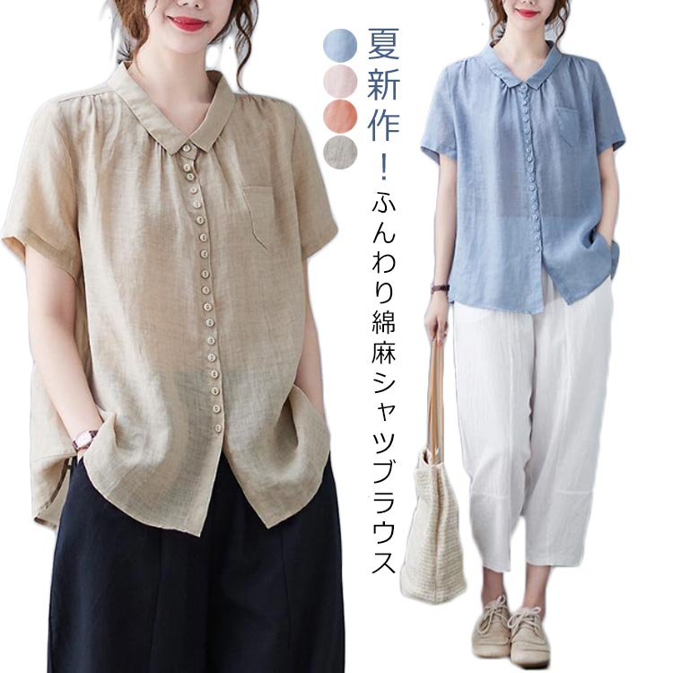 夏新作 ブラウス レディース トップス 半袖 ナチュラル 綿麻風 大人可愛い シャツブラウス トップス 涼しい ふんわり 体型カバー 夏春 薄手 前開き 丸襟 カジュアル ゆったり 大きいサイズ 通勤 通学 プレゼント ギフト 無地 シンプル 送料無料 20代 30代 40代