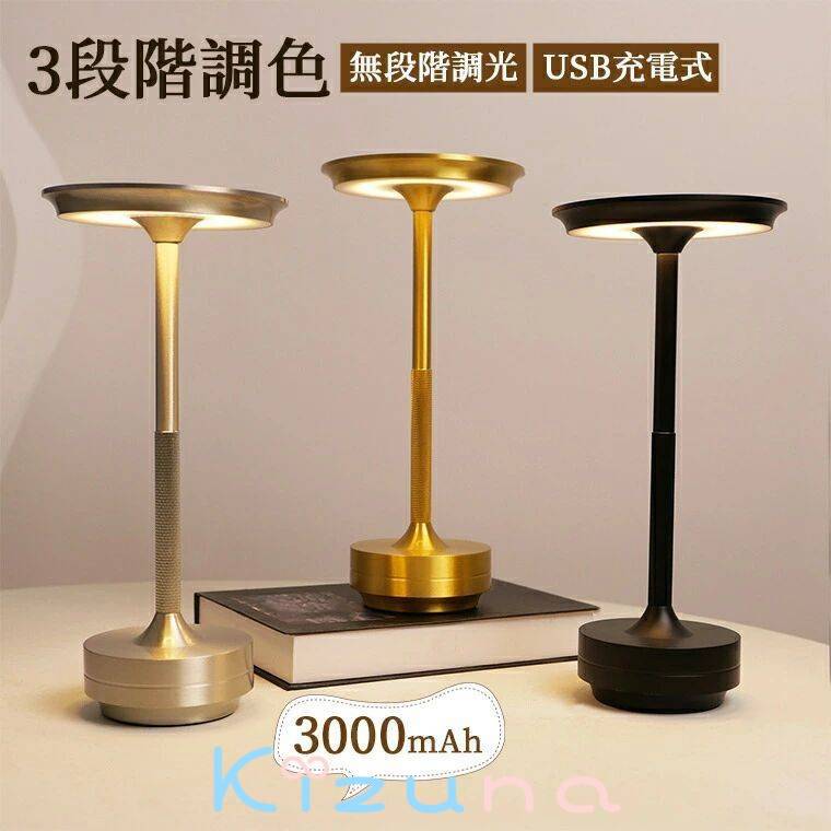 -商品ポイント- 【タッチ制御3段階調色無段階調光】 ランプ上部のスイッチを一度タッチすることで、3色「昼白色・電球色・温白色」の温度が切り替わります。スイッチを長押しすると、各モードの明るさをから100%まで無段階で調整可能です。 【インダストリアルな雰囲気】 マットな質感がインダストリアルな雰囲気を漂わせる、クールなデスクライト。すっきりとした上品なフォルムで、洗練されたインテリアをつくります。シンプルですがシェードのデザインが個性的なので、インテリアの一部としても空間に映えます。 【均等な明るさで照らす面発光で、光を均一に拡散させる】 ・寝る時には、暗くして、常夜灯のようにも使えます。 ・ソファーサイドに置いて、リビングを雰囲気良く照らす多灯照明の一翼を担ってもらってもいいです。 ・玄関にチェアなどを置いて、ぽっと明るい光で人を出迎えるのも良いと思います。 【コードレス使用可USB充電式】 コードレスタイプの3000mAh電池容量のUSB充電式でとっても使いやすい!おしゃれなでインテリアにもぴったり!どこでも安心して使える目に優しい光のテーブルランプ。 【どんな場所へもフィットするデザイン】 雰囲気を壊さずによりオシャレな空間を演出しています。リビング、ダイニング、寝室(ベットルーム)玄関ホール 居間 食堂 洋室の間接照明として。和室、茶室、一人暮らしからファミリー、リフォームや新築、建て替えなどにも。食卓用、ワンルーム、個室、居酒屋、カフェ、レストラン、料亭 、エステ、ネイル、サロン、 SPA 、スパ 、マッサージ 、旅館 、ホテルの間接照明として。民宿、アジアン雑貨店、古民家やアジア料理店などの飲食店にも。ちょっとした所に明かりを足せるテーブルランプ。どんな場所にも馴染んでくれるお洒落なデザインで、使い勝手も抜群。