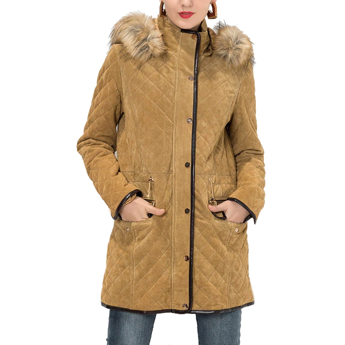 【送料無料!】全7サイズ! [Women's Detachable Hooded Pigskin Long Jacket]レディース デタッチャブルフードピッグスキンジャケット ライディングにはもちろん、毎日の通勤通学にもオススメの本革レザージャケット!! 【 特別価格! Women's Pigskin Genuine Leather Jacket 】 程よいカジュアルさとハードボイルドなアビエーターデザイン、 どんなコーデにもOKのマストアイテムです! 着古したようなこなれた風合いが魅力のスエードレザーライダース。 ライディング時だけでなく、普段使いにも適した味のある表情がなんとも ハードボイルド。ボトムスを選ばずジーンズや柄スカートとも相性良し♪ ピッグスキンなら、汗などで湿気がこもりやすいレザージャケットの難点を 見事にクリア!!その軽さと通気の良さ、摩擦に対する強さが特徴のピッグスキンは、 汎用性の高さとこれらの特徴から、高級ブランドなどでも使われている素材です。 他の革と比較しても丈夫で傷つきにくい豚革は、デイリー使いにもお出掛けにも最適。 ビンテージな革の質感とクラシックなキルティングデザインが目を引くポイント。 サッと羽織れば気取らないこなれ感を演出し、これ一枚でアメカジスタイルに。 スモールさんからビッグサイズの方にも嬉しい、 驚きのSから4XLサイズまでお値段均一でご提供!! 【仕様】 長袖、前面スナップボタン&ジッパー開閉、両側ハンドポケット、 キルティング加工、取外し可能フード、ファー付き襟、ロング丈 【素材】 本革(ピッグスキン)スエード、裏地:ポリエステル 【カラー】 ベージュ(Beige) 【サイズ】 ■S :胸囲96cm/適した実寸胸囲86-89cm/肩幅40cm/着丈77cm/袖丈64cm ■M :胸囲100cm/適した実寸胸囲90-93cm/肩幅41cm/着丈78cm/袖丈65cm ■L :胸囲104cm/適した実寸胸囲94-97cm/肩幅42cm/着丈79cm/袖丈66cm ■XL :胸囲108cm/適した実寸胸囲98-101cm/肩幅43cm/着丈80cm/袖丈67cm ■2XL:胸囲112cm/適した実寸胸囲102-105cm/肩幅44cm/着丈81cm/袖丈68cm ■3XL:胸囲116cm/適した実寸胸囲106-109cm/肩幅45cm/着丈82cm/袖丈69cm ■4XL:胸囲120cm/適した実寸胸囲110-113cm/肩幅46cm/着丈83cm/袖丈70cm 【ご注意下さい】 ※サイズチャートを参考にサイズをお選び下さい。 ※サイズはあくまでも目安です。商品の個体差や個人差により、 着用感は異なる場合がございますので予めご了承下さい。 ※ジャケットのみの販売です。画像のジャケット以外の品は付属しておりません。 ※商品の仕様やデザインはメーカー都合により予告なく変更になる場合がございます。 メーカーに「在庫がある商品」では通常、お届けまでに「3週間前後」のお時間を頂いております。メーカーに「在庫がない商品」に関しましては、お届けまでに「1ヶ月以上」、またはタイミングにより「売り切れ」や「生産終了」となっている場合がございますので、何卒ご理解下さいますようお願い致します。また、商品によっては説明不足な点や、システムのタイムラグによって納期や入荷状況が表示内容とは異なっている場合がございますので、お届けまでのお時間や商品についてのご不明な点などがございましたら、どうぞお気軽にお問い合わせ下さい!商品画像はできる限り現品を再現するように心がけておりますが、ご利用のモニターにより差異が生じますので予めご了承下さい。 メーカー在庫品で3週間前後、在庫がない商品に関しましては、売り切れ・廃盤もしくは1ヶ月以上お時間を頂戴致しますので、予めご了承くださいますようお願い致します。