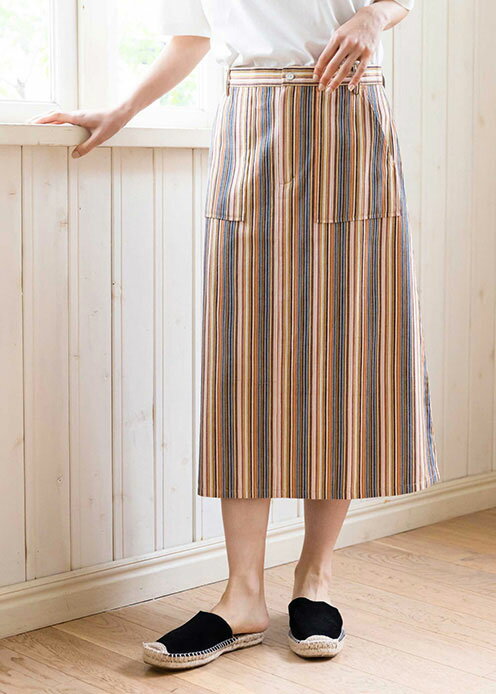 表情豊かなマルチストライプは、街でもリゾートでも映える特別な存在感。オーガニックコットンの手織り生地を使った、コーディネートのアクセントになるボトムシリーズです。フロントとヒップにあしらった大きめポケットが目を引くスカートです。シンプルなプリントTシャツや無地カットソーなどを合わせるだけで、おしゃれに決まります。●フロント貝ボタン・ファスナー開き、前後にパッチポケット/オーガニックコットン100%/アーティザン・ハット/バングラデシュより※モデル身長170cmでMサイズ着用M:ウエスト79、ヒップ100、総丈77.5cmL:ウエスト85、ヒップ106、総丈79.5cm ※ラッピングをご希望の方は こちら よりラッピングサービス(税込550円)をご追加ください。
