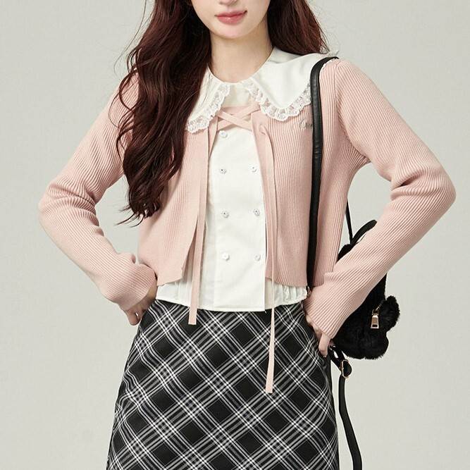 ニットカーデ レディース トップス カーディガン 上着 羽織り ショート 長袖 襟なし ノーカラー フロントレースアップ 前編みあげ 刺繍 薄手 ニット ストレッチ 伸縮性 かわいい 大人可愛い きれいめ シンプル カジュアル 上品 おしゃれ キュート 無 韓国 オルチャン