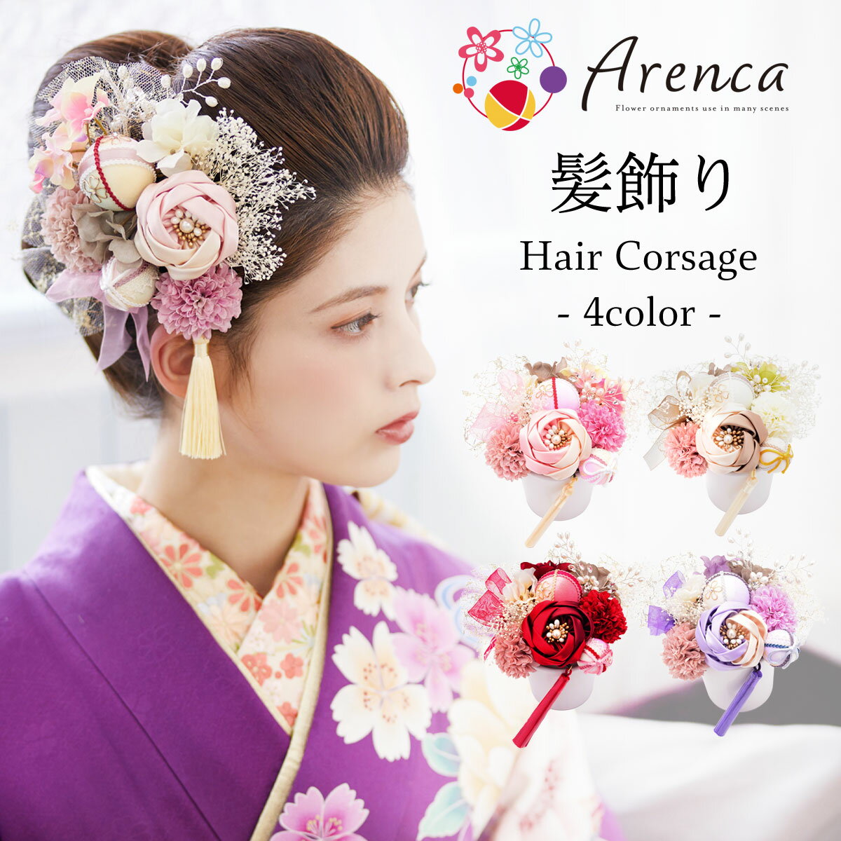 【Arenca】髪飾り 成人式 花髪飾り Uピン 15点セット フラワーポット入り インテリア パッケージ 選べる 4色 「アンティーク ローザ」 薔薇 レッド ピンク パープル ベージュ くすみカラー 振袖用 お花飾り プリザーブドフラワー 成人式 卒業式 結婚式 着物 日本製