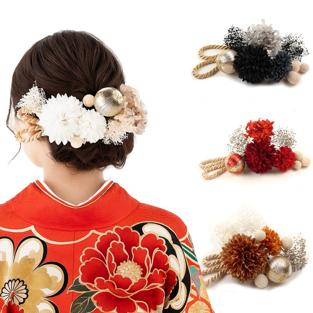 髪飾り 成人式 結婚式 和装 マム プリザーブドフラワー 和 11点セット 振袖用 ウェディング 卒業式 袴 花 着物 ヘアアクセサリー ヘッドドレス かすみ草 組紐 レッド ブラック ホワイト ゴールド