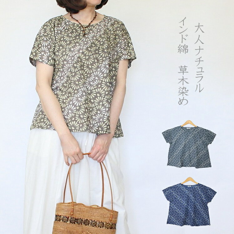 【メール便OK】インド綿 草木染め コットン100% ブロックプリント ブラウス プルオーバー バグルー 半袖 花柄 Aライン ショート丈 涼しい 軽い 大人 ナチュラル