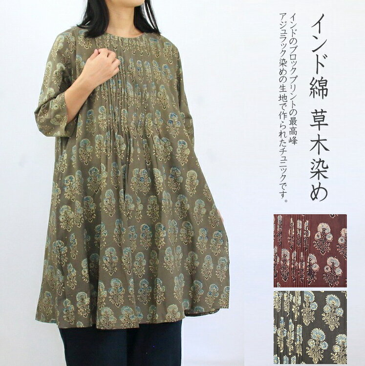 【送料無料】インド綿 アジュラック 草木染め ブロックプリント チュニック ピンタック 七分袖 ポケット付き 大人エスニック