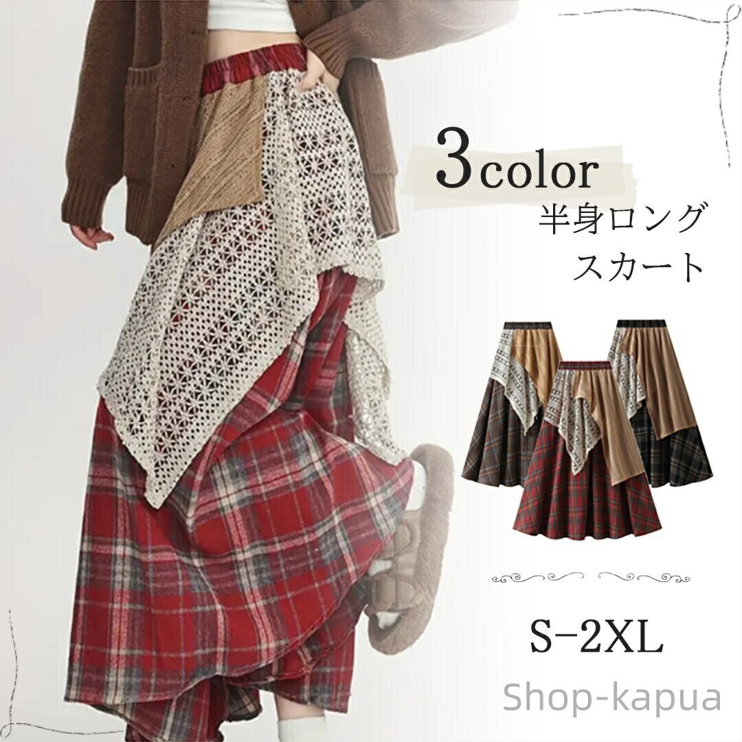 【送料無料】ロングスカート 秋 冬 カラーブロック柄 ウエストゴム S-2XL