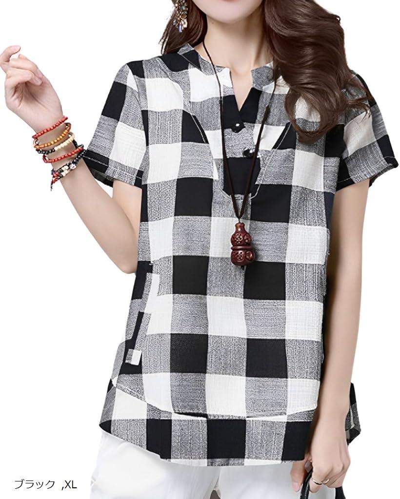 チェックシャツ スキッパーシャツ ノーカラー レディース 半袖 ブロックチェック柄 プルオーバー カジュアル 通勤 おしゃれ 綿100 (ブラック, XL)