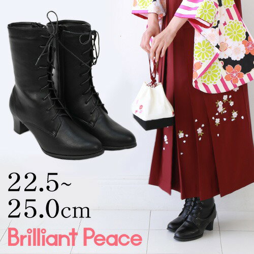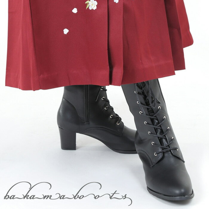 サイズ交換可能【基本送料無料】ブーツ 編み上げ 袴向き レースアップ 黒 ブラック 卒業式 二尺袖 扱いやすい合皮 サイドジップ