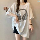 かわいい 女性 ロングT 2025夏 女性用 ヘビーデューティー ホット ドリル プリント 半袖 Tシャツ 大きめ サイズ mm ミドル 丈 腹 囲 商品 大きいサイズ トップス