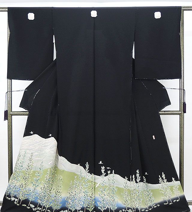 ■□■□■□■□■□■□■□■□■□■□■□■□ 【商品説明】 加賀友禅・星野高志作の黒留袖です。 グレーや草色・ブルーなどの多色で支笏湖の風景が柄付けされています。 加賀友禅らしい上品な黒留袖です。 [加賀友禅] 加賀友禅は「加賀五彩」とよばれる臙脂・藍・黄土・草・古代紫の五色で構成され、デザインは写実的で、武家風の落ち着いた趣があり、刺繍や箔押しを使わずに、「ぼかし」や「虫食い」などの表現でアクセントをつけています。 絵画調の柄を特徴とする加賀友禅は、写実性を強めるための 白い線はときには太く、ときには細く変化をつけることで装飾効果をも高めています。 ボカシや虫喰いの技法もよく使われています。京友禅が内側から外側にボカシてあるのに対し、 加賀友禅では逆に外側から内側に向かってボカシてあるのが一般的な特徴といえます。 ◆作家名:星野高志 ◆作品名:支笏湖 ◆表地:絹100% こちらの訪問着は未仕立(反物)の状態です。 ご希望の寸法へのお仕立ても承ります。 ■手縫い仕立(胴裏・比翼・紋入れ込み):+63000円 ■ハイテク仕立(胴裏・比翼・紋入れ込み):+53000円 ■パールトーン加工:+13200円 ■ガード加工:+6600円 ◆お仕立て日数:約30~40日 ◆胴裏・比翼:正絹(絹100%) お仕立てご希望の際は、ご注文後にご希望の寸法ををお知らせください。 お仕立てご希望の際のお支払いは代金引換以外をお選び下さい。 ■□■□■□■□■□■□■□■□■□■□■□■□◆◇新品からリサイクル・中古まで。。着物や帯・和装小物が勢揃い。。◆◇