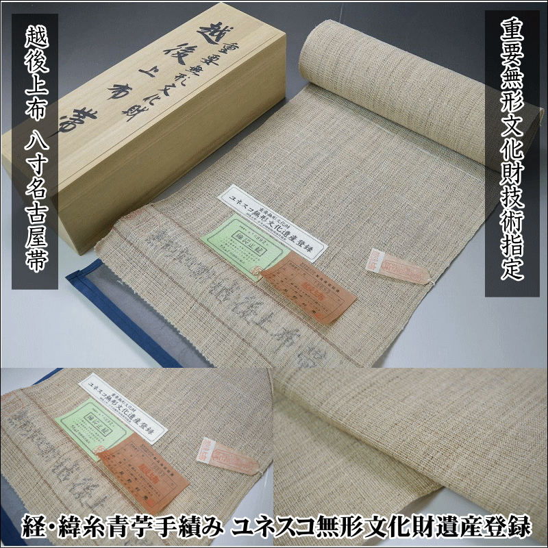 極上の逸品 重要無形文化財技術指定越後上布 八寸名古屋帯 星野利光作 経・緯糸青苧手績み ユネスコ無形文化財遺産登録 越後上布技術保存会確認証 重要無形文化財指定技術「いざり機織」 帯 未仕立て 自然布 【重要無形文化財による製品確認票 登録番号17062】