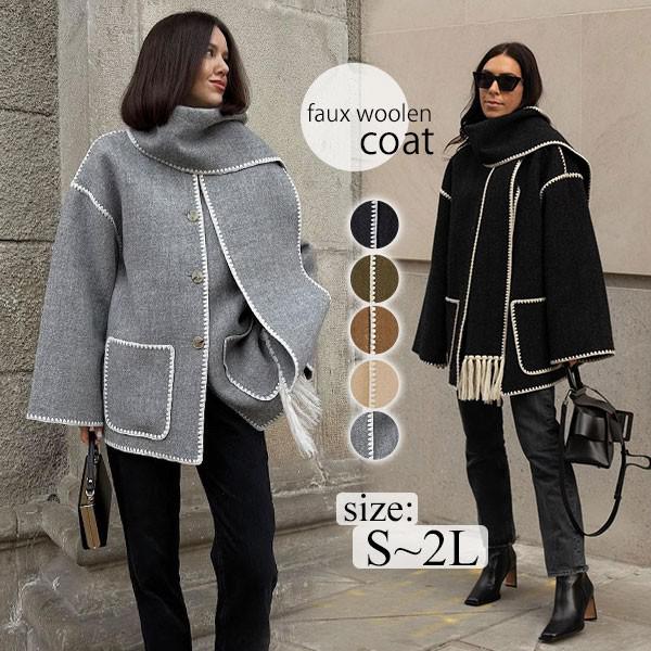 ショートコート レディース アウター ジャケット 欧米風 大人 おしゃれ フェイクウール 長袖 マフラー風デザイン ポケット付き 防寒 暖かい 秋冬 通勤 通学 オフィス カジュアル 体型カバー S〜2L グレー ブラック ベージュ ブラウン カーキ sy009cycyx1