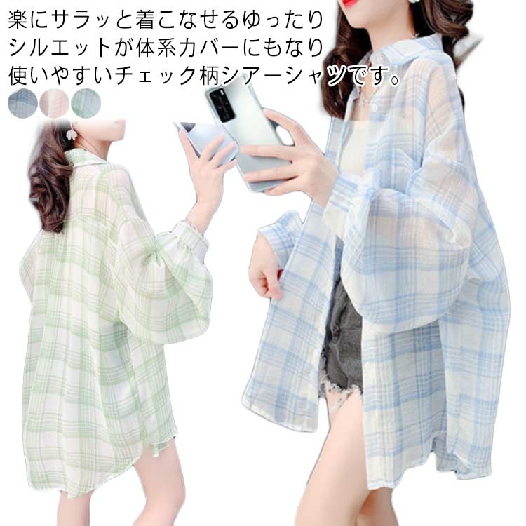 ロング シャツ チェックシャツ 春 トップス ボリューム袖 シアー レディース M 夏 UVカット 長袖 ロングシャツ サマーシャツ シアーシャツ 透け感 きれいめ シースルー 薄手 オーバーサイズ 紫外線対策 S 2XL L XL チェック柄