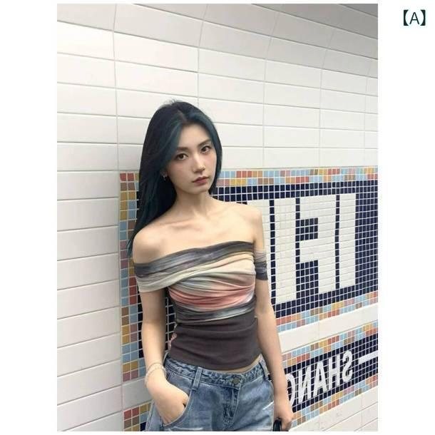 フリル シャーリング トップス レディース 春夏 かわいい Pure Desire Hot Girl ワンショルダー ステッチ ス ミッジ メッシュトップ 女性用 夏な プリーツ ショート Tシャツ 女性用x2