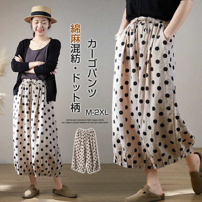 ロングパンツ 綿麻 春 春夏 カーゴパンツ レディース ドット柄 水玉 ワイドパンツ ロング 麻 リネン 大きいサイズ ワイド バルーンパンツ 涼しげ シンプル きれいめ ナチュラル カジュアル 肌触りよい 送料無料 通勤 日常 ゆったり 無地 体型カバー ウェストゴム