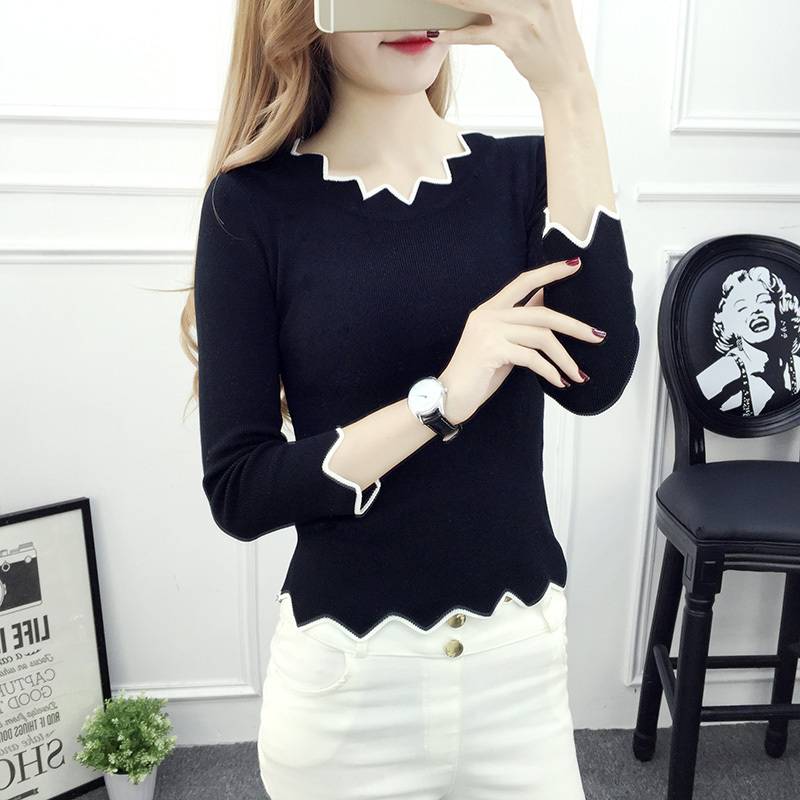 スカラップ ミドル丈 ニット レディース 送料無料 4色 七分袖 スリム トリム バイカラー トップス 袖あり スリム タイト 細身 きれいめ シンプル 上品 おしゃれ お洒落 女子 ラブリー クール モード系 ブラック ホワイト ブルー ピンク