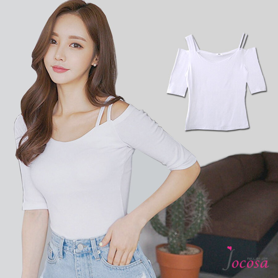 肩開き アシンメトリー ストラップ トップス レディース 春 夏 秋 新作 五分袖 カットソー ロング丈 無地 シンプル カジュアル タイト セクシー おしゃれ 韓国風 ホワイト S M L JOCOSA 8976 送料無料 即納