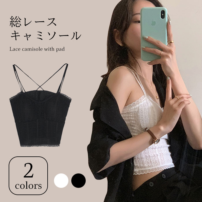 【送料無料】総レースキャミソール レディース カップ付き キャミソール 総レース レース パッド入り 細ストラップ ショート丈 へそだし ストレッチ 伸縮性 クロスストラップ トップス お洒落 セクシー キレイめ 夏新作