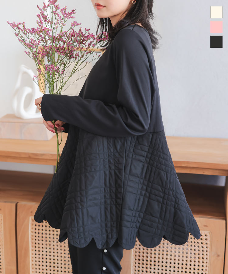 キルティング切替 スカラップ ペプラムトップス レディース ペプラム チュニック マタニティ ぺぷらむ キルティング スカラップトップス 異素材切替 秋 冬 秋服 冬服 クルーネック 丸首 骨格ストレート Aライン ドッキング [C7241] 【送料無料】