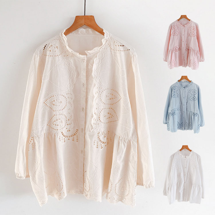 シャツ レディース ブラウス レース フリル襟付き 透かし彫り 長袖 ロング丈 ゆったり系 クルーネック 裾スカラップ トップス リラックス プルオーバー 大人 カジュアル 可愛い ナチュラル 通勤 通学 普段着 快適 通気性 綿 春 夏 秋 プレゼント 母の日 送料無料