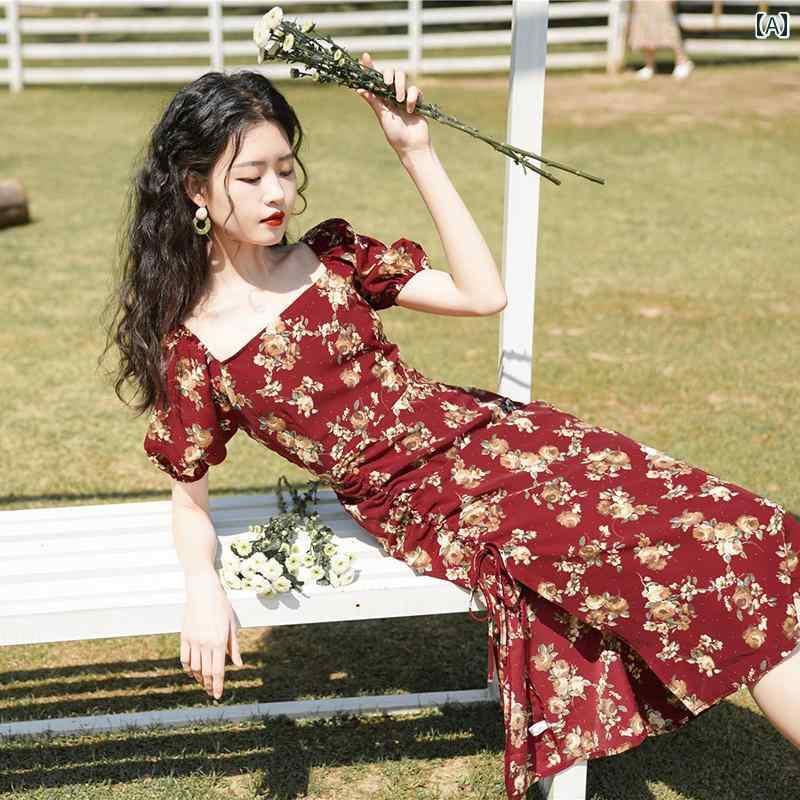 エレガント カラードレス ワンピース 2024年 レッド ティーブレイク フレンチ フローラル スリム スプリット スクエアネック ドレス レディース サマー スタイル レトロ スカート