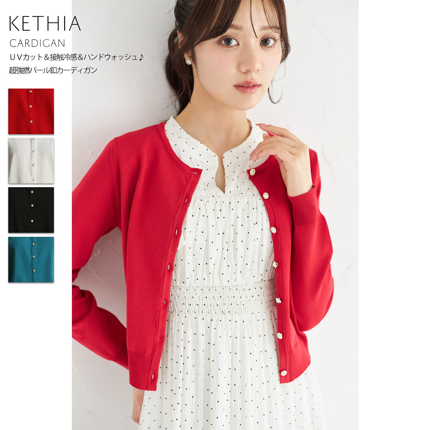 UVカット&接触冷感&ハンドウォッシュ♪超強撚パール釦カーディガン【kethia ケシア】tocco closet(トッコクローゼット) レッド オフホワイト ブラック グリーン 商品番号:186-193032