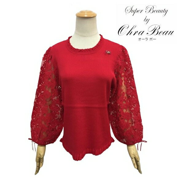 スーパービューティー セーター レースバルーン袖 フリルデザイン 2421006 レッド 2024年秋冬 オーラボー 大人かわいい服 大人スタイル キレイメ Super Beauty レディース アパレル 女性 M L LL 30代 40代 50代 60代 上品