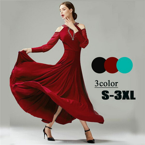 社交ダンス ドレス 社交ダンス 衣装 モダン ドレス 広がる裾 ワンピース スタンダード レッスン着 発表会 競技着 練習着 演出用 ワルツ専用ドレス ロング丈 オールシーズン ブラック 黒 グリーン 緑 ワインレッド 赤 s m l xl 2xl 3xl dm577c0c0x1