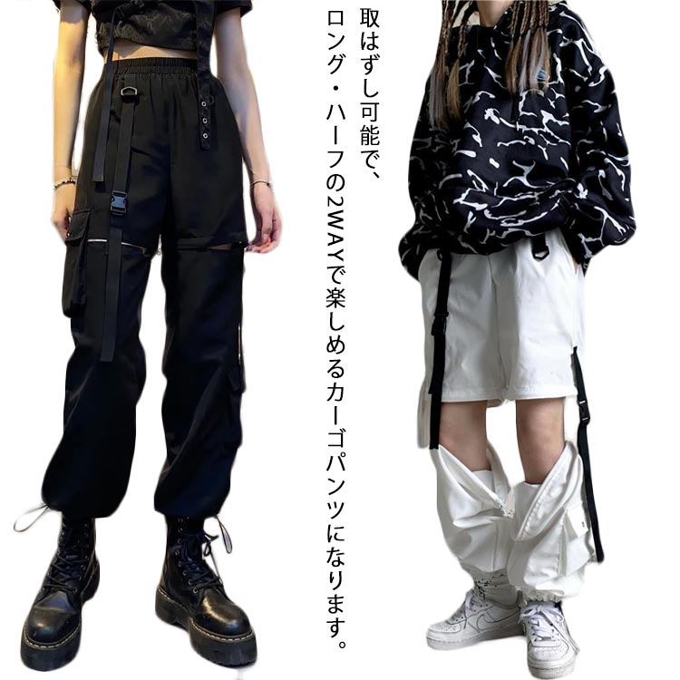 カーゴパンツ レディース ロング丈 ハーフ丈 2WAY 取り外し可能 長ズボン 短パン ウエストゴム オーバーサイズ ダンスパンツ ヒップホップ 団体服 イベント カジュアル 韓国 原宿系 ストリート おしゃれ かっこいい ホワイト ブラック 白 黒 送料無料