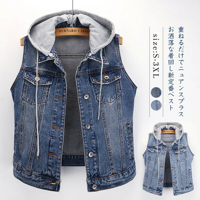 デニム ベスト レディース 春 ジレ ベスト レディース 春秋 ベスト レディース おしゃれ ベスト 秋 デニム 前開き トップス ベスト Gジャン ジージャン フード付き 取り外し可能 大きいサイズ ノースリーブ 羽織り 切り替え カジュアル 重ね着 通勤 OL 送料無料