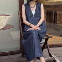 深Vネックが大人の抜け感を演出。ジャンバースカート 軽やかで上品なシルエットのノースリーブロングワンピース/涼感リネン風素材 ゆったり ストレートライン 送料無料