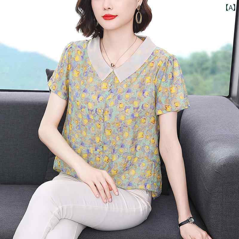 レディース 夏 カジュアル ファッション トップス シャツ ブラウス おしゃれ 上品 マザーズ 婦人服 普段使い ベビー ドール 襟 半袖 プルオーバー 女性 大きいサイズ お腹 カバー シフォン