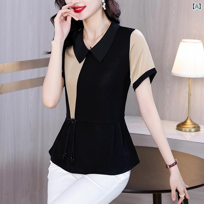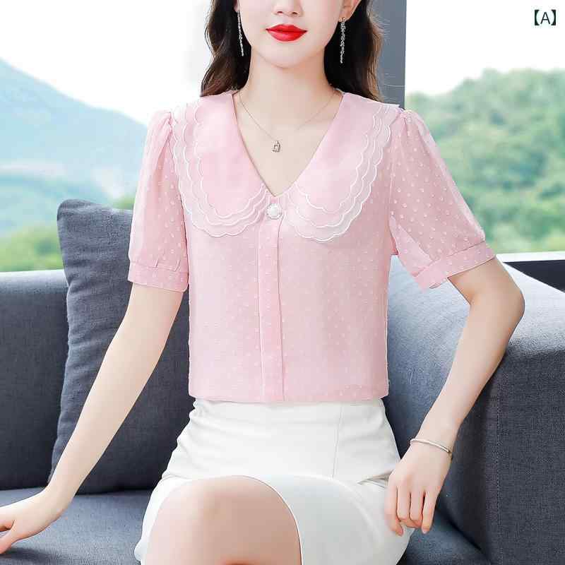 トップス シャツ レディース ファッション ブラウス おしゃれ 上品 マザーズ 婦人服 普段使い 大きめ サイズ 女性 夏 スリム スプライシング シフォンシャツ ベビー ドール 襟 小さい
