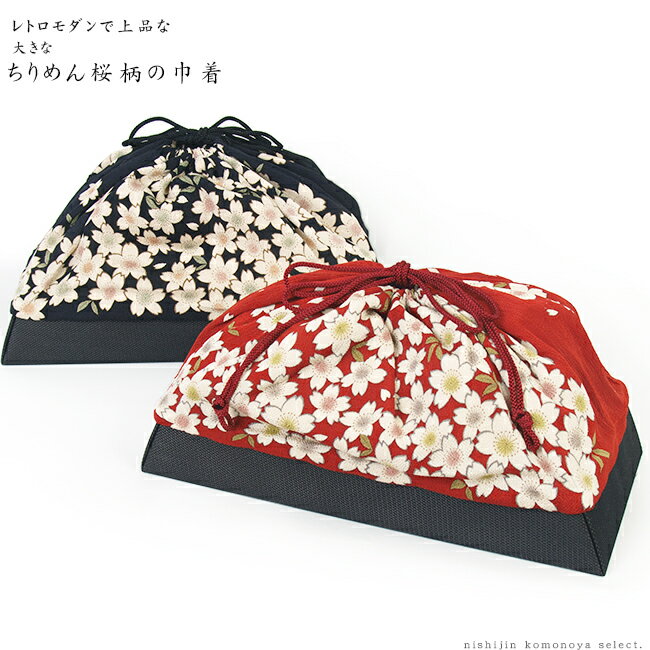 【日本製】大きな ちりめん桜柄の巾着【レトロ・モダン-四角・横長/籠(カゴ)バッグ】ちりめん地、桜柄、赤、黒・お稽古のバッグ・小物収納-巾着