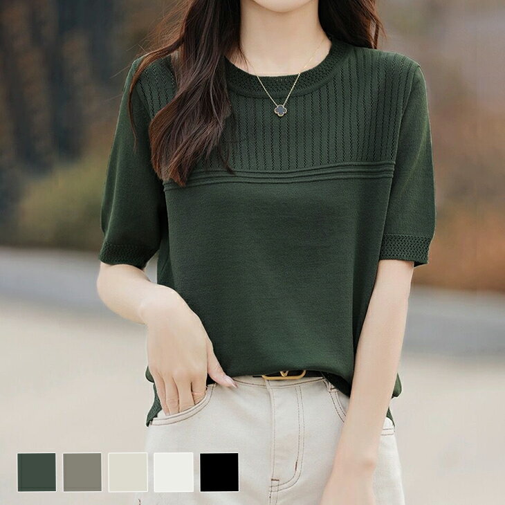 トップス カットソー 夏ニット ニット 五分袖 二の腕カバー ホワイト グレージュ カーキ ベージュ ブラック 黒 白 緑 灰色 レディースファッション 40代 50代 60代 ReRe 二の腕 細く見える 白 五分袖 5分袖
